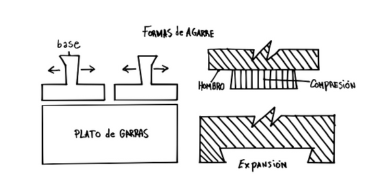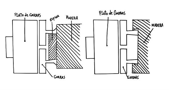 Antes de sujetar la pieza de madera en el plato de garras, es crucial prepararla creando un talón (espiga o tenón) con una ligera forma de cola de milano. El talón debe tener la longitud adecuada (máximo 1 cm) para encajar correctamente con las garras del plato y asegurar una sujeción firme. El ángulo de la espiga debe coincidir con el ángulo interior de las garras. El diámetro del agarre debe ser apropiado y directamente relacionado con las garras utilizadas. Por ejemplo, si las garras son de 2″, el agarre debería tener un diámetro de 2″-1/8, lo suficientemente grande para que las garras abracen completamente al cerrarse. Para la técnica de expansión, es necesario realizar un rebaje en la madera para que las bases de las garras actúen como tope, y los lados de las garras ejerzan la fuerza al abrirse en las paredes del rebaje. Estas paredes también deben seguir la forma externa de cola de milano de las garras, siguiendo la misma regla del diámetro de las garras en relación al tamaño del rebaje.