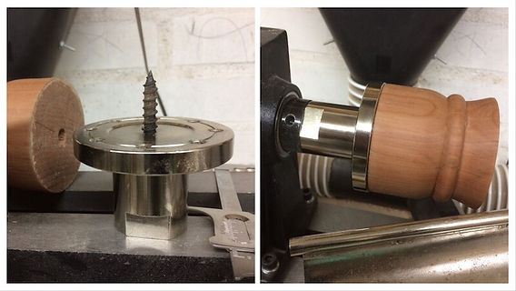 Es un accesorio que se fija al eje del torno y posee un solo tornillo en su superficie para asegurar la madera. Es fácil de construir y muy común en los talleres de tornería, aunque deja un orificio profundo en la base o pie del objeto. Personalmente, también lo utilizo en los platos de garras, ya que la mayoría de estos platos incluyen un sub-accesorio adaptador que convierte el plato en un tornillo centro.