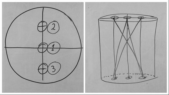 Ejes torcidos: En este caso, los puntos operan fuera del centro cilindrado, empleándose únicamente los puntos y ejes nuevos. Por lo general, se disponen a 120 grados, aunque los grados y la cantidad de puntos pueden variar, especialmente en trabajos más artísticos. Los ejes se conectan de manera intercalada, no de forma paralela. Por ejemplo, desde una cara, el punto 1 se conecta con el punto 2 de la cara opuesta, el 2 con el 3, y el 3 con el 1.