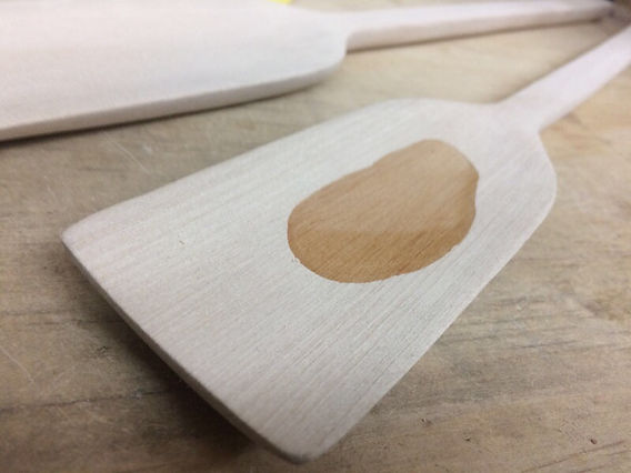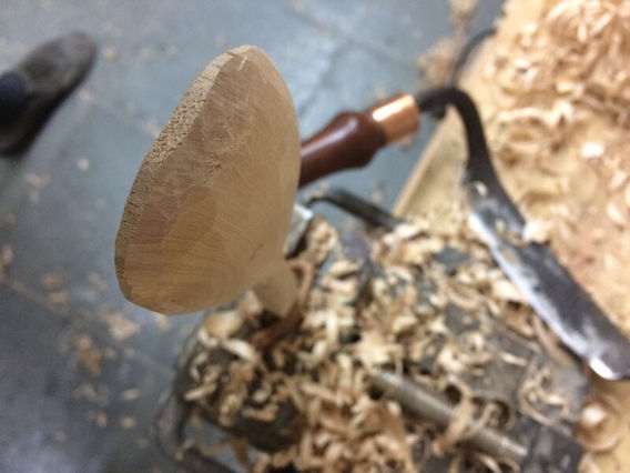 El cuenco: idealmente el cuenco se realiza antes de cortar la silueta de la cuchara, esta etapa de tallar el fondo se puede realizar solo con una herramienta, por ejemplo una Gubia 6/35, siendo una mayor profundidad o realización de alguna textura la razón por lo cual se utilicen gubias y herramientas extras. Una rasqueta redonda puede mejorar la curva del cuenco y facilitar el lijado.