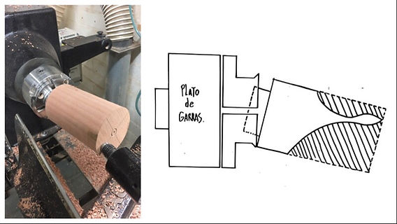 Para trabajar con este método, primero cilindramos la madera y creamos el talón (espiga o tenón) en la pieza con una ligera forma de cola de milano (el talón no debe superar el diámetro externo de las garras del plato). Colocamos el talón de manera oblicua para generar el descentrado, apoyándonos en el contrapunto hasta que la vibración disminuya y forme la nueva silueta. Con un buen agarre, no deberíamos tener problemas a menos que utilicemos una velocidad inadecuada.