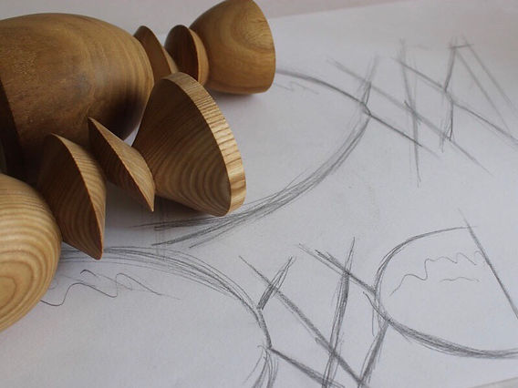 Siempre trazo mis diseños en papel, determino los números y tipos de cortes que crearán la «forma» y la escala, para luego transferir estas dimensiones y valores al objeto mediante una plantilla. Esta plantilla puede elaborarse en cartón, madera o metal, utilizando compases para marcar y trasladar las proporciones y medidas al trabajo torneado.