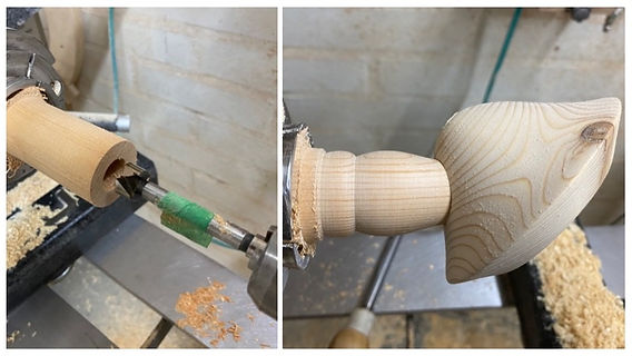 Damos vuelta la pieza encajando la pestaña fabricada de 50 mm en las garras del plato, para poder sujetar la pieza por medio de la expansión de las garras. Comprobamos las medidas del cuerpo asegurándonos que la parte alta y más fina tenga 50 mm de diámetro (donde encajara nuestro techo). Terminamos la perforación de 40 mm con la broca forstner, y volvemos a sujetar con la contrapunta en caso de ser necesaria alguna corrección de la forma y líjanos (para el lijado yo utilizo 80, 120 y 180).