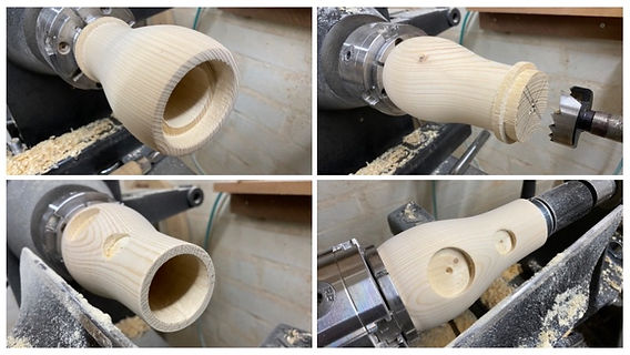 Con la ayuda de un plato de garras podremos sujetar la pieza desde el agarre que ya hemos torneado. Aprovechamos de hacer los agujeros parciales y decorativos del cuerpo de 22 mm y 40 mm con un taladro (para simular una ventana y puerta del cuerpo del proyecto). Quitamos la contrapunta, y procedemos a crear otra pestaña de encaje de 50 mm, con una profundidad de 1/2 «: Desbastamos primero con una gubia, con una medida cercana a los 50 mm y corrigimos su diámetro, profundidad y ángulo con un Bedan o beading, para luego terminar de realizar y conectar el vaciado completo de 40 mm por medio de una broca forstner .