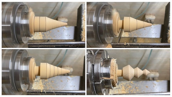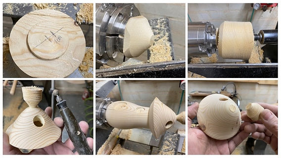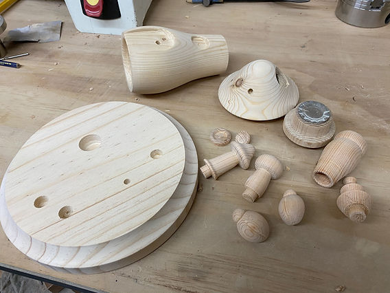 En esta fase, no es preciso entrar en muchos detalles, pero es importante señalar que en ciertas piezas, después de ser torneadas, modifiqué levemente el eje para conferirles una inclinación al ensamblarlas, mediante la espiga creada con el diámetro seleccionado (proceso opcional). Para el pequeño pino y los honguitos, mantuve una espiga de 12 mm, mientras que para las cochinitas empleé una espiga de 8 mm.
