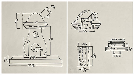 La chimenea es bastante sencilla: partiendo de un bloque de 1-1/4″ x 1-1/4″ x 2″, realizamos una perforación de 16 mm a lo largo del bloque, lo cilindramos y le damos forma según el diagrama. Al ensamblar estas piezas, nos aseguramos de lograr una conexión con el vaciado del techo y de permitir la salida del humo del incienso.