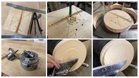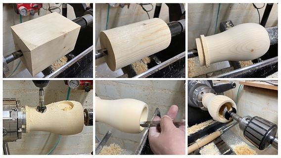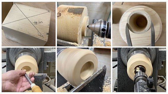 Podemos realizar las perforaciones de encajes y vaciado para el cuerpo y el techo opcionalmente fuera del torno, si contamos con brocas de paleta o forstner. Si fuese el caso, necesitarán por ejemplo dos brocas: de 50 mm para el encaje del techo y el cuerpo, así como la pestaña que encajará la base del cuerpo con en el porta incienso, y otra de 40 mm para el vaciado del cuerpo, y el pequeño vaciado del techo.
