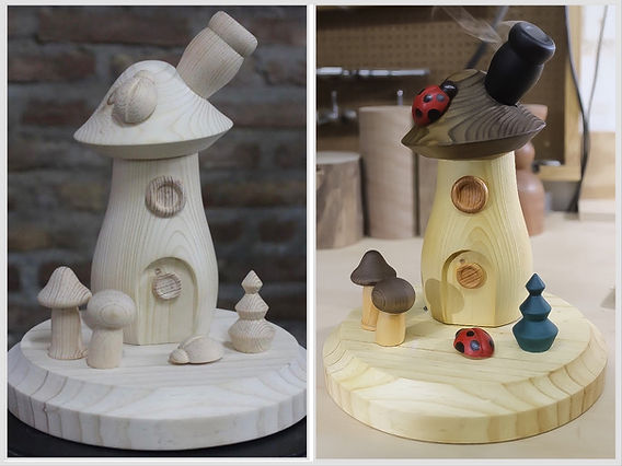 El proceso evoca en parte la elaboración de casitas para pájaros, con una base, cuerpo ahuecado y techo. Además, incluiremos elementos fundamentales como una chimenea encajada en el techo para el escape del humo y una base pequeña para el incienso. Opciones decorativas, como pequeñas figuras torneadas de hongos, duendes, insectos o pinos, pueden añadirse para dar un toque personal.
