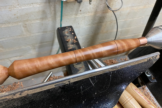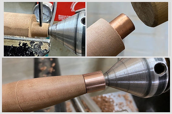 Con la virola colocada a presión, volvemos a montar el torno para dar la forma deseada a nuestro cabo. Lijaremos la virola como parte integral de nuestro mango, alcanzando, en el caso del metal, un lijado hasta el número 1000 si así lo preferimos.