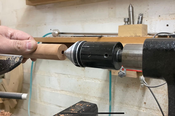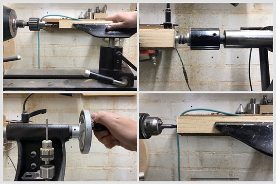 El procedimiento se realiza a baja velocidad (200 rpm en lo posible) extendiendo el eje de la contra punta, girando la manivela para empujar lentamente la madera hacia la broca y perforar.