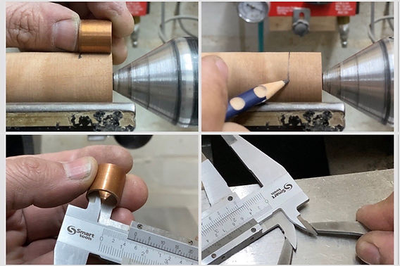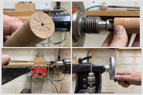 Ambas formas de montar y tornear el cabo ya perforado se encuentran aquí: el método sin cilindrar y el otro con cilindrado. Al devolver al torno sus partes tradicionales, la punta del contrapunto giratorio encajará en el nuevo agujero y empujará el madero contra el otro extremo, con las cuchillas ya marcadas en la punta de arrastre.