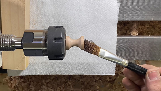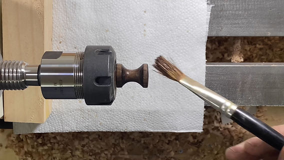 El uso de accesorios como un mandril (accesorio esencial entre los torneros) que pueda sujetar la espiga del tirador, o un collet chuck o similar, fijado en el cabezal del torno, facilita el proceso. Es tan sencillo como aplicar el líquido con un pincel grueso, hacer girar el torno por unos segundos, detenerlo y aplicar una segunda capa repitiendo el proceso las veces que sean necesarias. Luego, se puede aplicar el acabado, como cera de abejas, cera de carnauba o aceites.