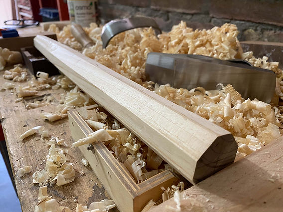 En el caso del torno a pedal y rueda, preparé y luego torneé las espigas de tres patas en aproximadamente dos horas, casi llegando al punto de rendirme debido al cansancio. Antes del torneado, realicé la preparación de las vigas con un rasero para darles forma octagonal.