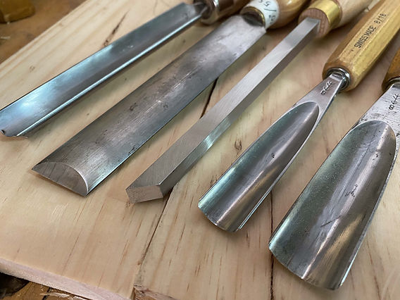 En cuanto a las herramientas, se utilizan sesgos, gubias clásicas de torneado, gubias de tallado de media caña (que contribuyen al proceso de tallado en este tipo de torneado) y diversos cortadores. Las herramientas modernas fabricadas a partir de una barra redonda, como la gubia spindle, no funcionan bien. Un consejo importante es mantener afiladas las herramientas y darles un buen filo y asentado, similar a lo que haríamos con una herramienta de tallado.