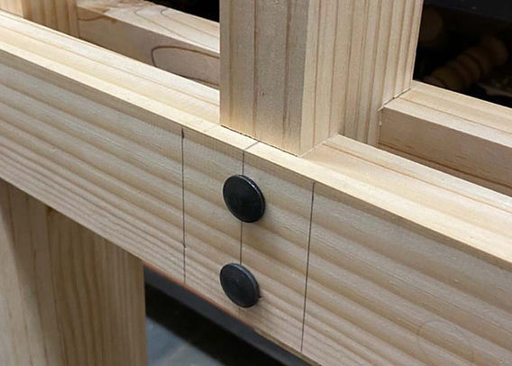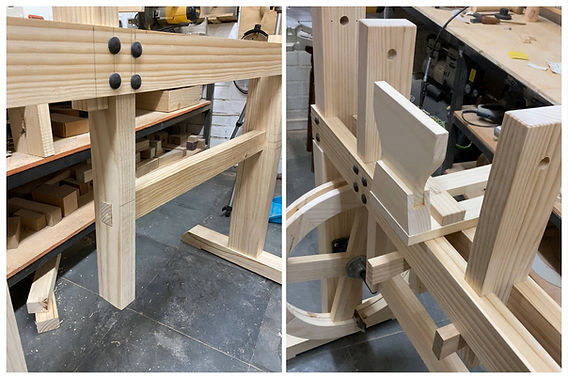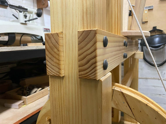 El ensamblaje del torno se llevó a cabo mediante uniones simples, como ensambles a media madera, espigas y conexiones de tablones para las patas y otras partes, todo asegurado con varios pernos y tuercas, lo que lo hace completamente desmontable. Si bien no alcanza un nivel carpintero de excelencia, considerando que mi enfoque en esta nueva área se centra principalmente en la «funcionalidad», estoy satisfecho con el resultado.
