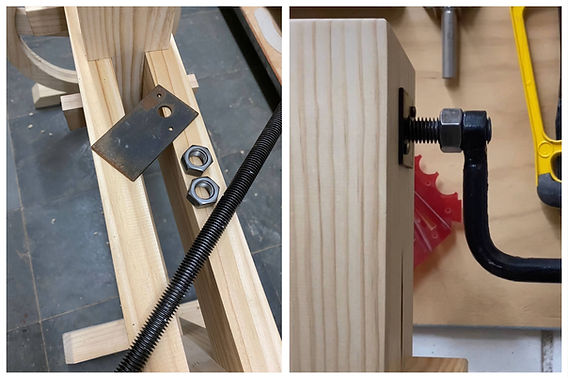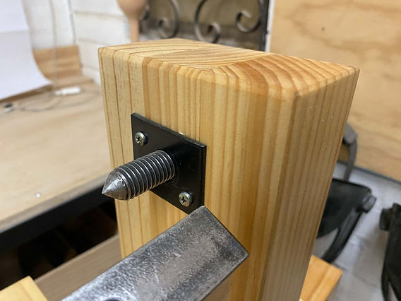 En el bloque de la contrapunta (como se muestra en la foto siguiente), se incrusta una tuerca de 5/8″ en la madera y se cubre con una placa metálica. De esta manera, es posible ajustar y liberar la barra hilada para sujetar o soltar la pieza de madera que se va a tornear.