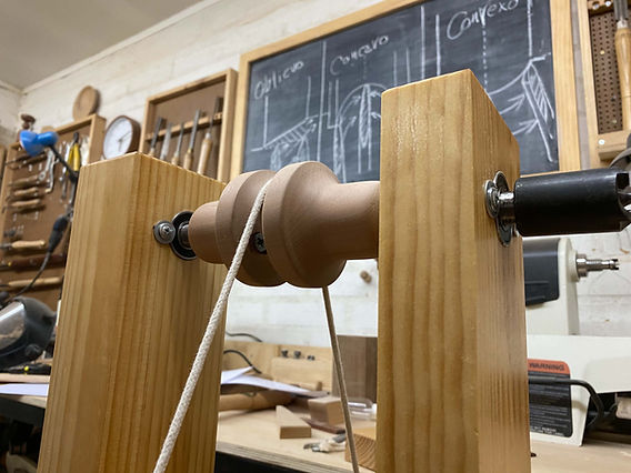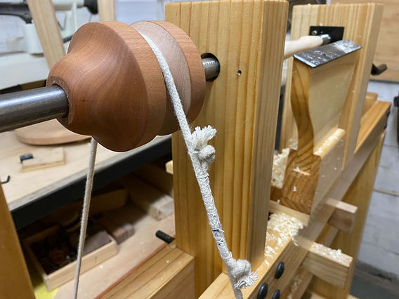 Respecto a la cuerda que impulsa la rueda y la polea que se coloca en el eje principal, idealmente, se utilizaría cuero, pero solo tenía disponible una cuerda común, que, sin embargo, cumple su función. La polea está hecha de raulí y se fija al eje con un perno.