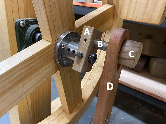 Este mecanismo permite que la rueda gire al accionar un sencillo pedal. La forma más práctica que elegí consiste en fijar una pieza de madera (A) al eje. Para crear la palanca, he asegurado una barra (B) en la misma pieza de madera, a una distancia de 1-1/2″ a 2″ del eje. Esta barra adicional sostiene una tablilla con un orificio holgado (D) que permite generar el giro al presionar y accionar el pedal para mover la rueda. Finalmente, se coloca un tope (C) en el extremo de la barra para evitar que la tablilla se desplace. Ambos elementos de madera (A y C) se fijan con pernos prisioneros.