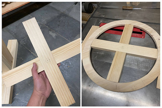 La rueda originalmente fue un prototipo, pero al ver vídeos de ruedas supuestamente “correctamente fabricadas” y girando descentradas, opté por mantenerla como la versión definitiva. Las limitaciones de materiales determinaron las dimensiones de mi rueda, aunque lo ideal habría sido que fuera un poco más grande. Creé un aro central utilizando una plancha de 3/4″ de grosor (que incluso podría estar hecha de MDF o terciado) y seleccioné un radio interior de 17″ y un radio exterior de 21″. Luego, lo aseguré a una cruz de 17″ x 17″, compuesta por dos piezas de 1″ x 2-1/2″, que se ensamblaron de forma conjunta y donde atravesaría el eje.
