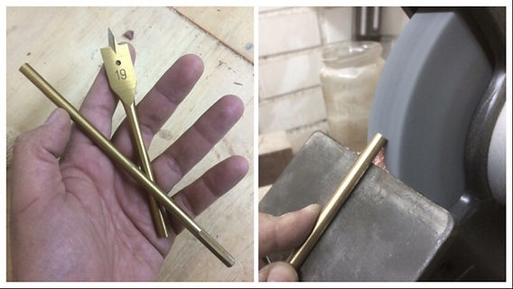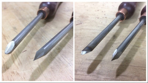 Las herramientas «coving tool» y «point tool» las he confeccionado a partir de una broca de paleta desechada. El acero de buena calidad de estas brocas me ha brindado resultados satisfactorios. La «point tool» tiene tres lados y se utiliza principalmente para marcar limpiamente y trabajar en los bordes, mientras que la «coving tool» ha sido modificada con un corte diagonal y un micro bisel para desempeñar funciones similares a una micro gubia de detalle, permitiendo la creación de concavidades y canales para el texturizado.