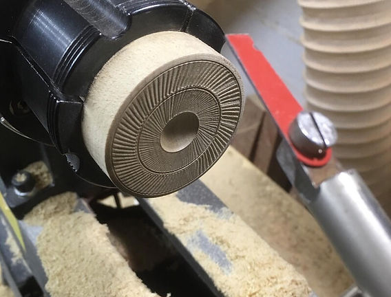 El segundo texturizador, renombrado como «Marcador/Fresador», utiliza una fresa de bola o cilíndrica que gira junto a la pieza a texturizar para marcar un patrón de fresado. La técnica implica inclinar la fresa diagonalmente para que los patrones del filo queden en la superficie. Las velocidades que suelo utilizar oscilan entre 600 y 800 rpm. Este texturizador es útil para decorar trompos, tapas de caja, costados y bases de torneados.