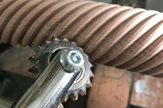 El primer texturizador es una herramienta que, mediante un fleje, crea marcas en la superficie de la madera. Cuando la madera gira, esta herramienta actúa como un percutor. Debido a la falta de una traducción adecuada para esta herramienta, la he rebautizado como «herramienta de estriar» o «estriador». La empleamos comúnmente en tapas de cajas, costados cilindrados y trompos. Para obtener los mejores resultados, se recomienda torneado en grano y velocidades que rondan las 1000 rpm.