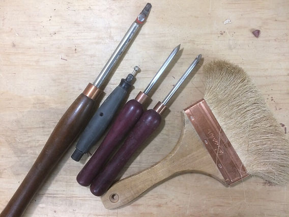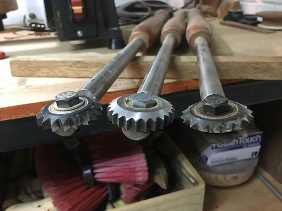 Además, he creado mis propios texturizadores caseros, como el estriador y el fresador, utilizando materiales reciclados en mi taller. También he fabricado herramientas de apoyo, como una «coving tool» y una «point tool». Es necesario tener habilidades para hacer cabos en torno con sus respectivas virolas para fabricar estas herramientas.