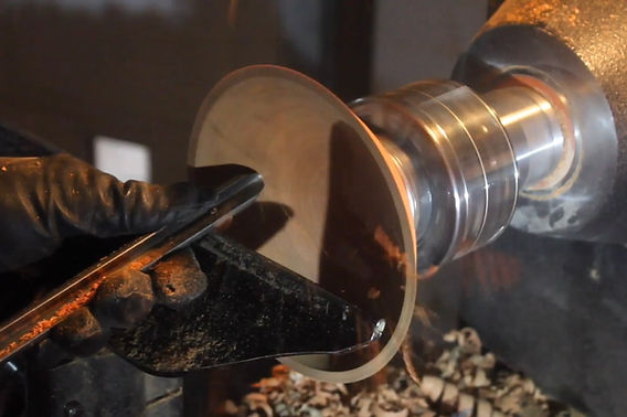 Vaciado de caras end grain: comenzando desde el centro, donde ubicamos el punto de inercia como referencia para nuestros cortes, introducimos ligeramente la punta de la herramienta. Realizamos el vaciado en un trayecto desde el centro hacia afuera, alcanzando el borde previamente delimitado hasta lograr la profundidad deseada. La utilización de un formón raspador para ajustar el vaciado dependerá de la precisión con la que hayas trabajado el interior.