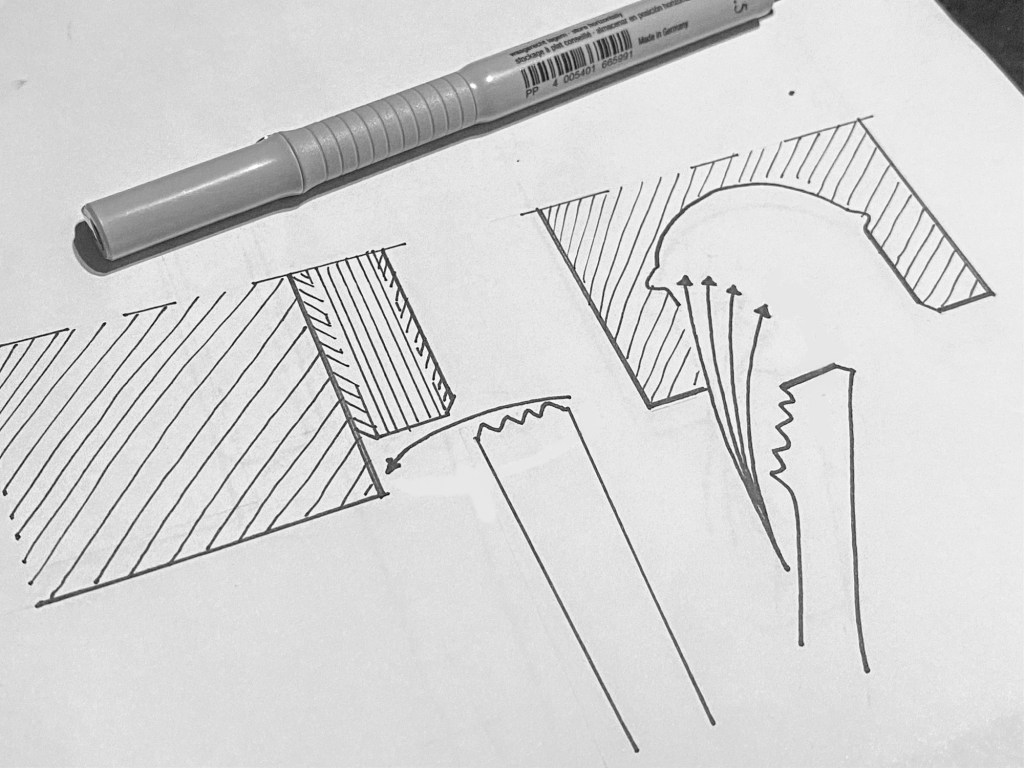 Para la rosca interna (preferentemente empezamos con la tapa), se comienza cortando desde el borde, inclinando el peine desde la izquierda, y de a poco, mientras vamos creando los hilos, se avanza con repetidas pasadas hasta completar el marcado de la rosca con el peine.