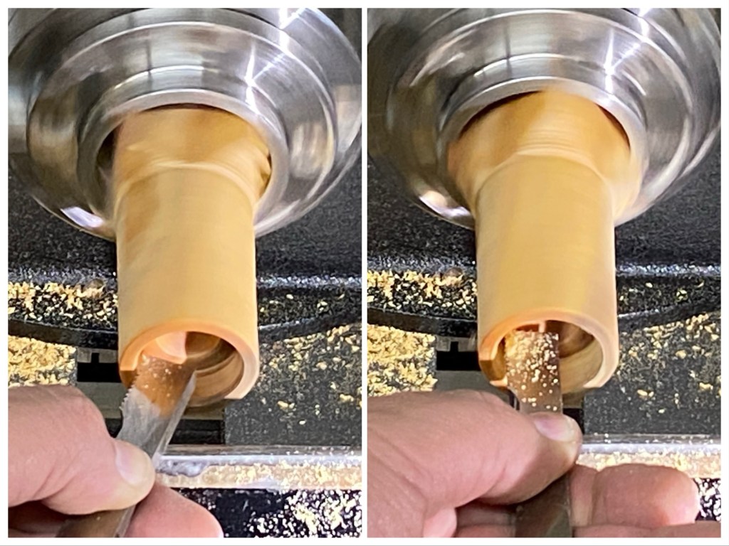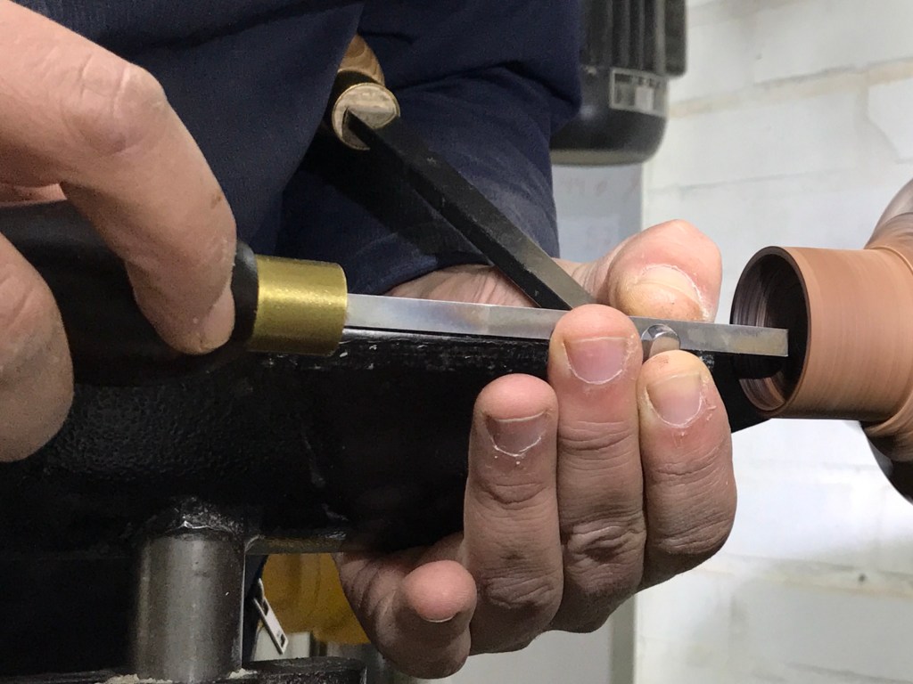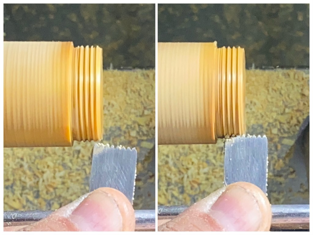 En el caso de la rosca externa, el inserto deberá ser previamente 2 mm más ancho para compensar el espacio que ocuparán los hilos. El método para crear los hilos externos puede consistir en realizar un movimiento circular mientras se corta, alejando el peine y luego volviendo al inicio. Iremos probando con la tapa si enrosca con facilidad o no, para decidir si continuamos con el proceso de ajuste o si comenzamos de nuevo (borrando el hilo) en caso de que no encaje correctamente.